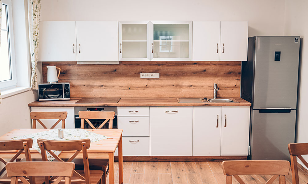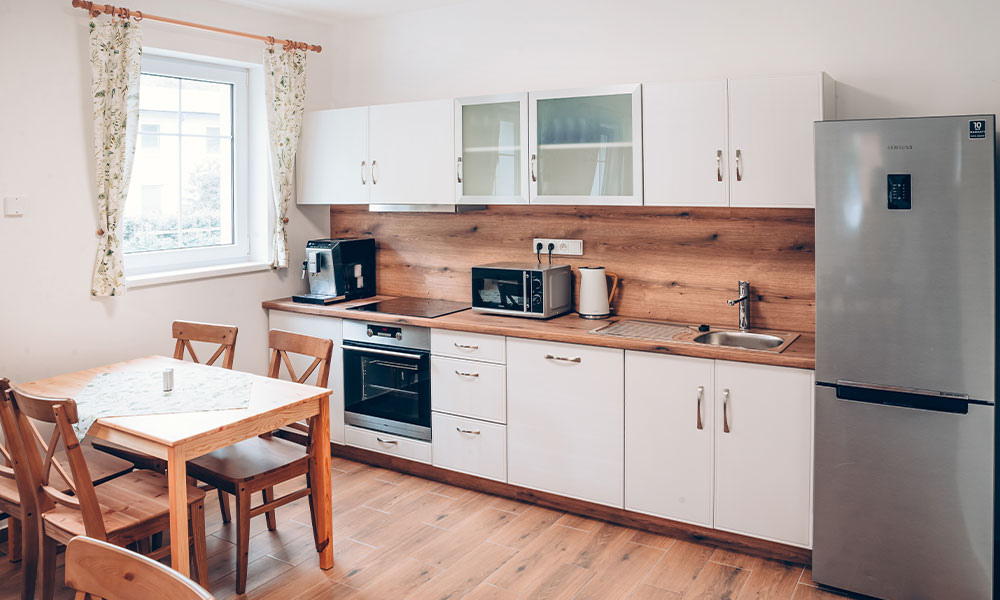 - Apartmá disponují vlastní koupelnou, TV a vybavenou kuchyňskou linkou